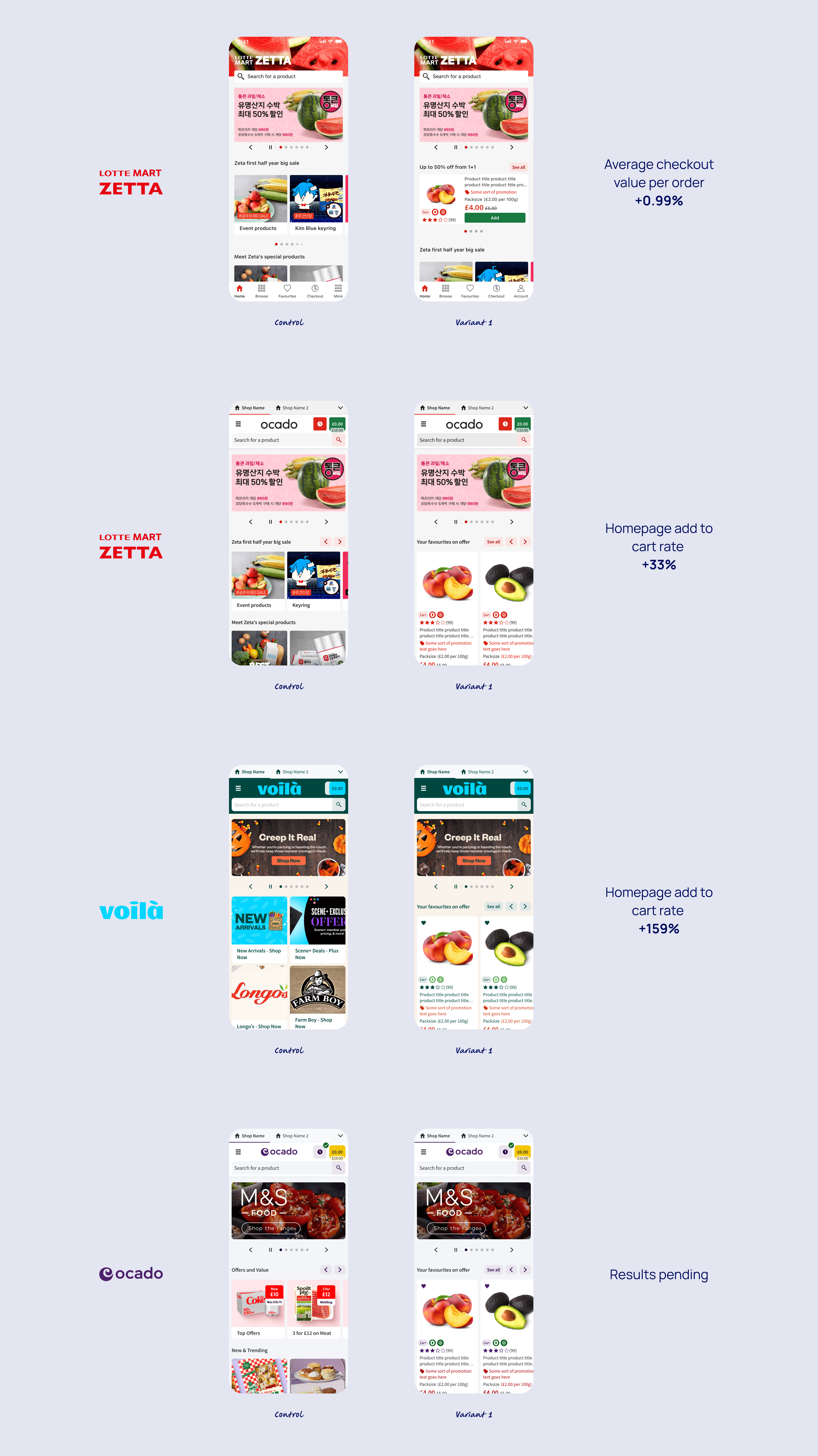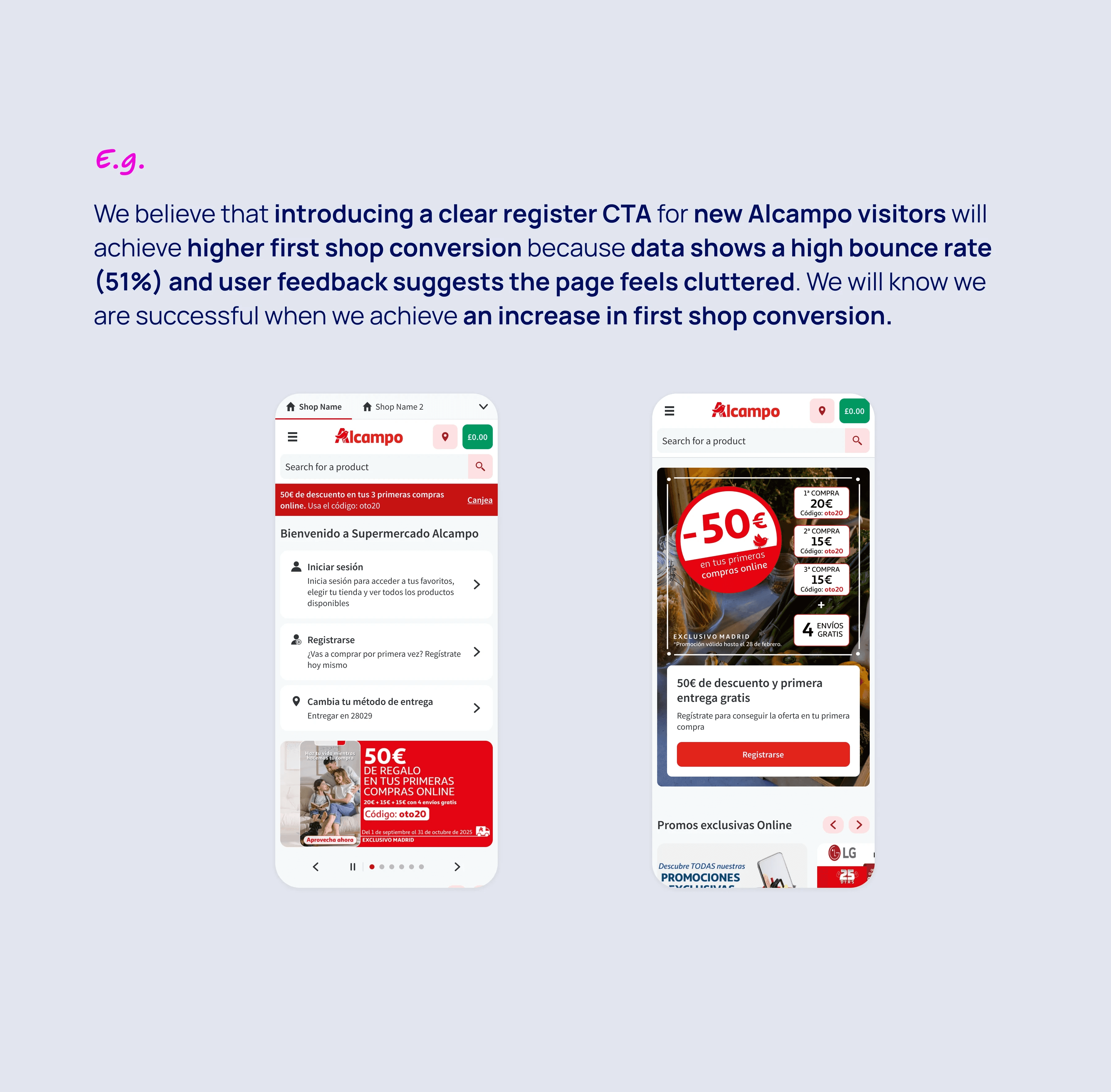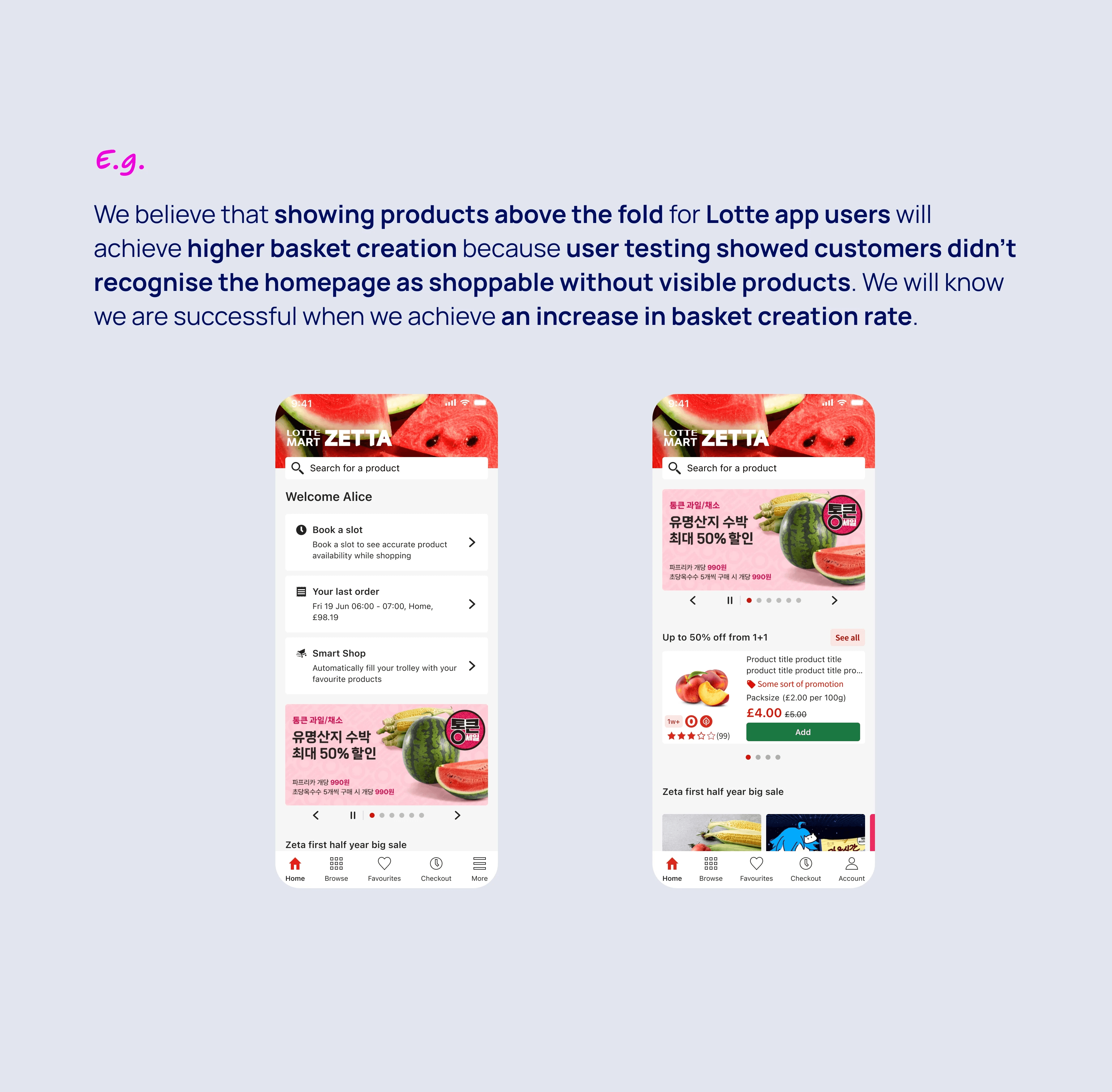 We believe that showing products above the fold for Lotte customers will achieve higher basket creation because user testing showed customers didn’t recognise the homepage as shoppable without visible products. We will know we are successful when we achieve an increase in basket creation rate.