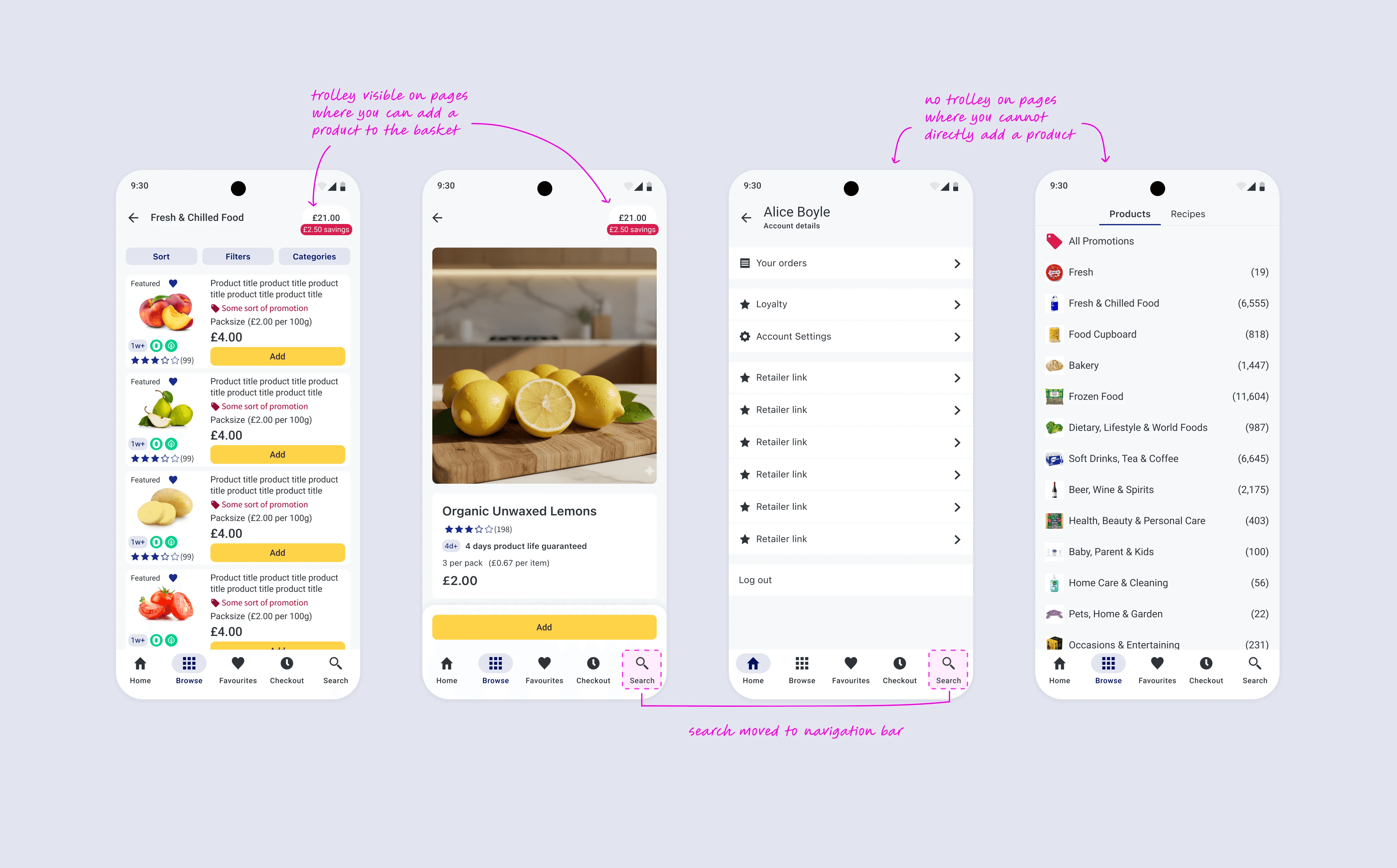 For higher-risk changes (including search behaviour, minimum spend, and Android FAB patterns) I ran usability tests to validate the designs before development.